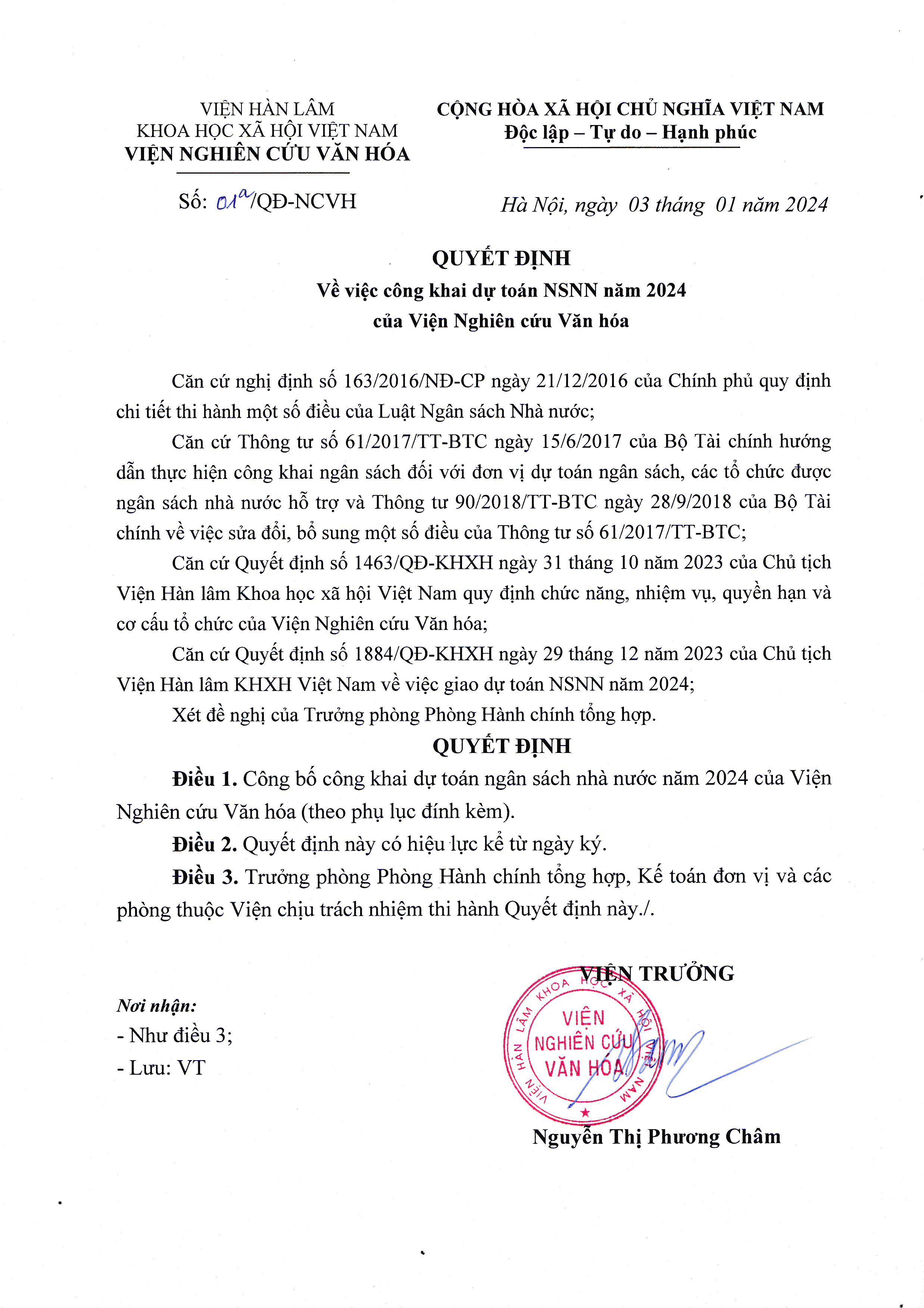 Quyết định v/v công khai dự toán NSNN năm 2024 của Viện Nghiên cứu Văn hóa
