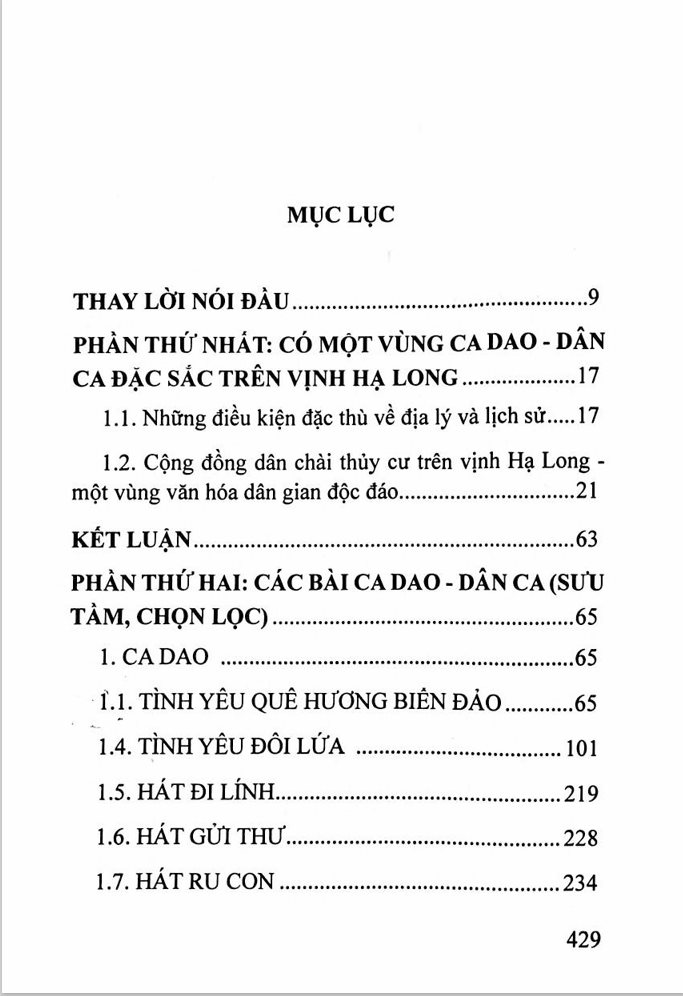 Cuốn sách giới thiệu những điều kiện đặc thù về địa lý, lịch sử và cộng đồng dân chài thuỷ cư trên vịnh Hạ Long; các bài ca dao, dân ca của dân chài trên vịnh Hạ Long