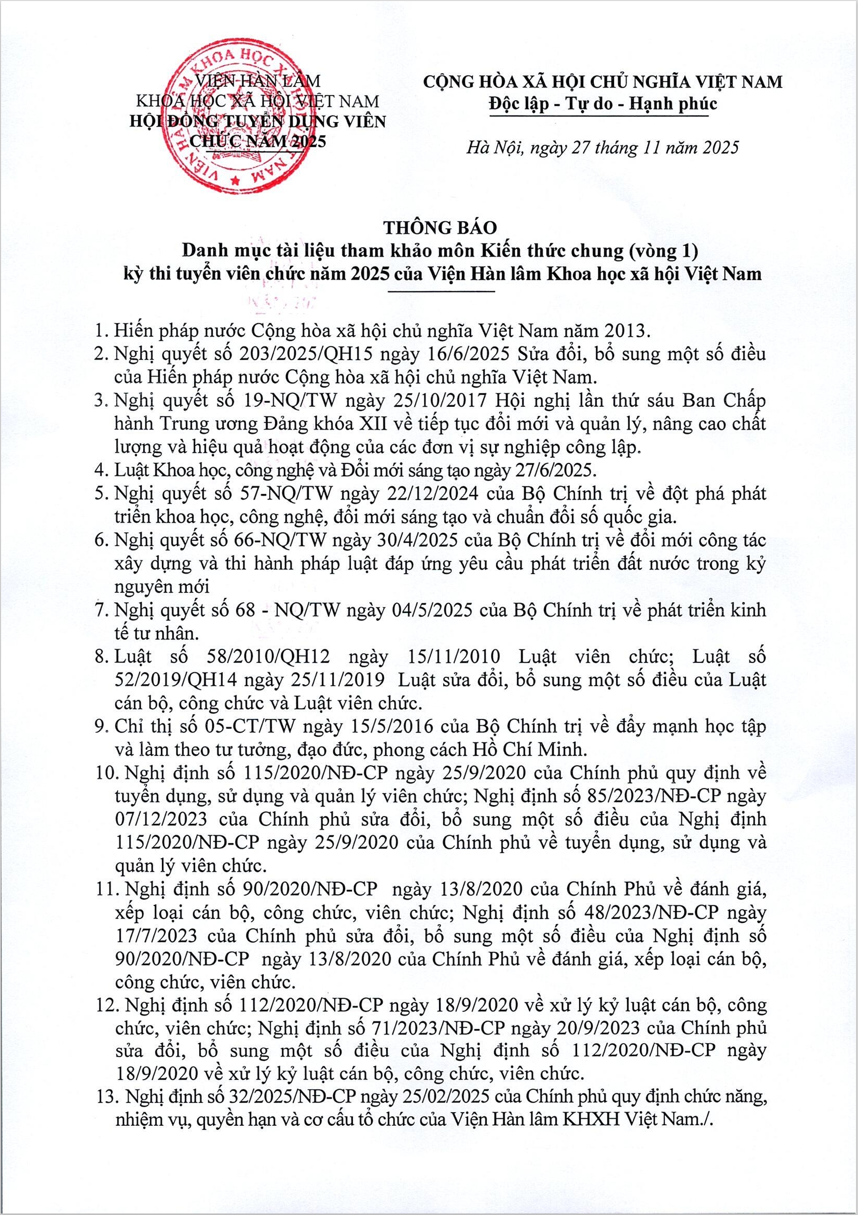 Thông báo danh mục tài liệu tham khảo môn Kiến thức chung (vòng 1) kỳ thi tuyển viên chức năm 2025 của Viện Hàn lâm Khoa học xã hội Việt Nam